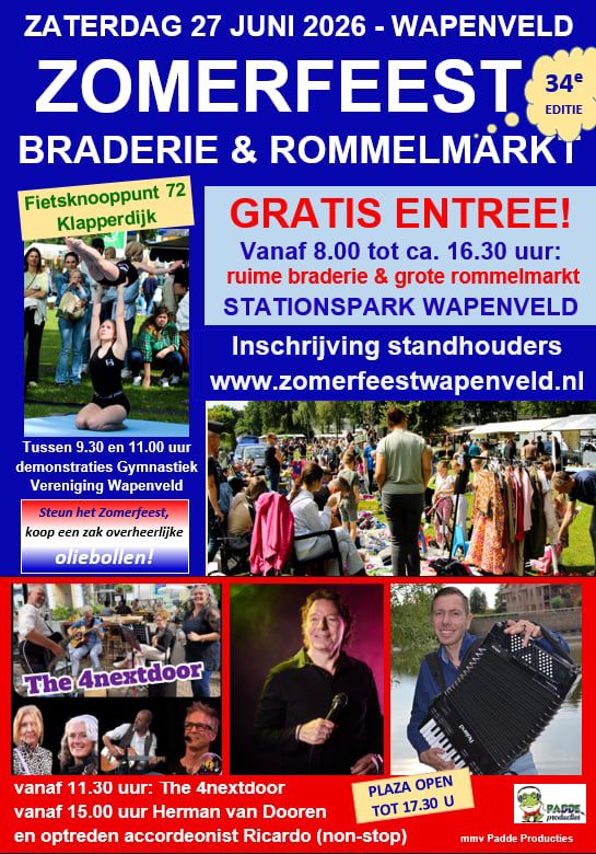 Het comité heeft de inschrijving geopend en maakt zich op voor de 34e editie van het Zomerfeest Wapenveld. Inmiddels een begrip in de wijde regio. Jaarlijks staat het Stationspark bomvol handel en geven optredens van plaatselijke verenigingen en live optredens een mooie invulling tijdens de dag. Natuurlijk zijn er ook de nodige kramen te vinden welke iets voor de inwendige mens te bieden hebben.